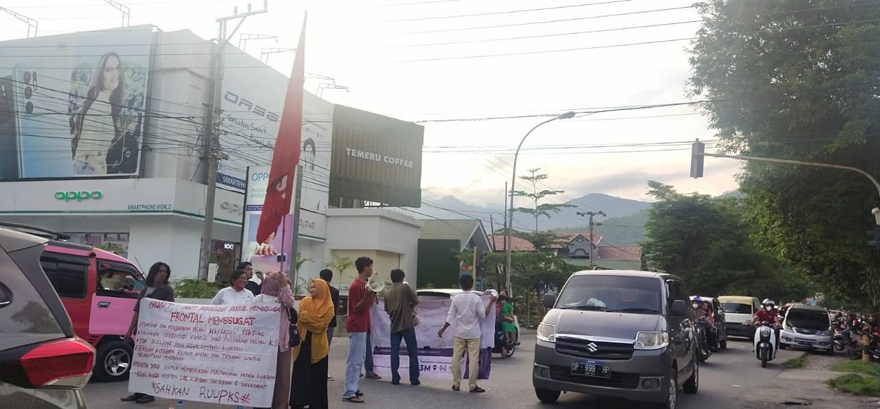PALOPO | Sejumlah mahasiswa yang tergabung dalam aliansi front anti kekerasan seksual menggugat (Frontal Menggugat ) kembali melangsungkan aksi damai di Jalan Trans Sulawesi, Kota Palopo, Provinsi Sulawesi Selatan.