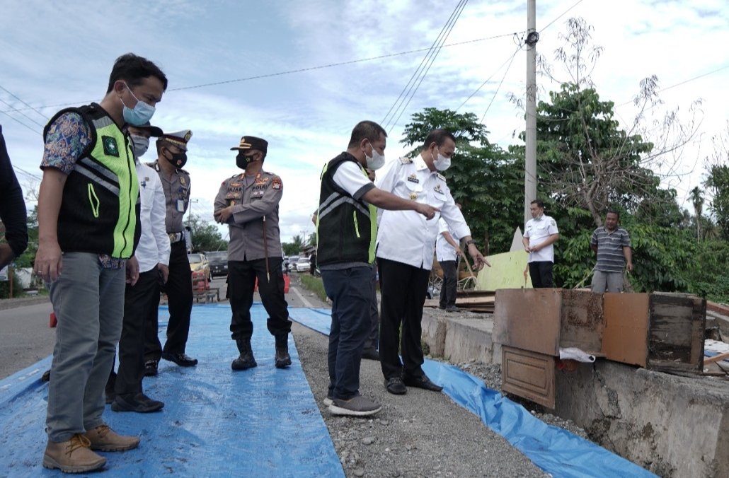 LUWU, | Bupati Luwu, Dr. H. Basmin Mattayang tinjau langsung lokasi tanah bergerak pada Jalan Poros Palopo-Belopa yang berada di Desa Salu Paremang, Kecamatan Kamanre, Rabu (14/07/2021).