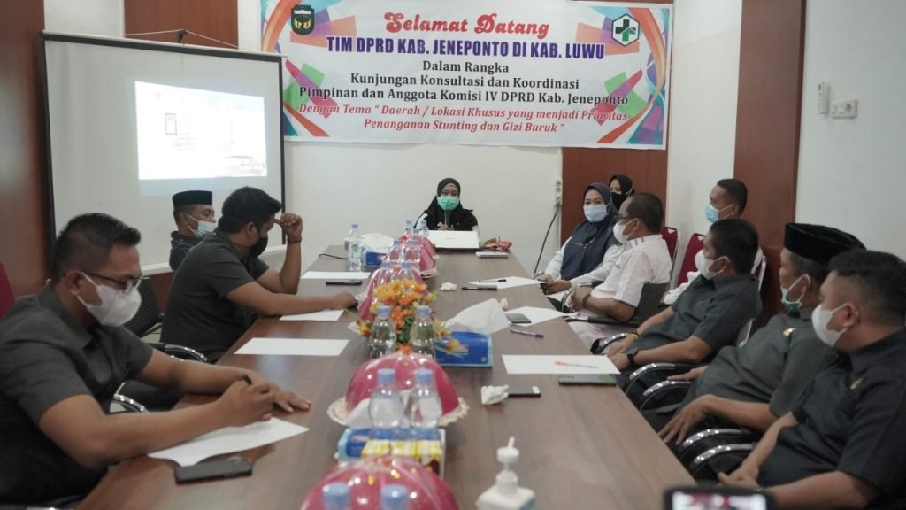 LUWU, | Komisi IV Dewan Perwakilan Rakyat Daerah (DPRD) Kabupaten Jeneponto mengunjungi Kabupaten Luwu dalam rangka konsultasi dan koordinasi terkait penanganan stunting dan gizi buruk. Rombongan anggota DPRD Jeneponto diterima oleh Kepala Dinas Kesehatan, dr Rosnawary Basir di Kantor Dinas Kesehatan, Kelurahan Sabe Kecamatan Belopa Utara, Kamis (25/3/2021)