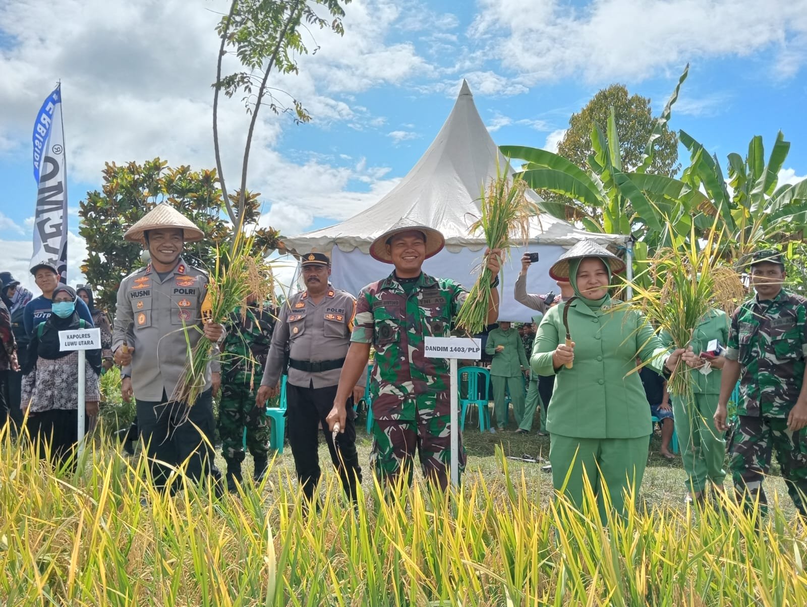 LUWU UTARA, | Kodim 1403 Palopo dan masyarakat Luwu Utara menggelar panen raya padi guna mendukung program ketahanan pangan nasional tahun 2024, di Desa Kapidi, Kecamatan Mappideceng, Kabupaten Luwu Utara, Kamis (18/04/24).