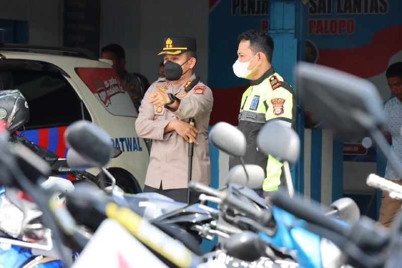 PALOPO, | Kapolres Palopo AKBP H. Muh Yusuf Usman bersama Pejabat utama dan didampingi Kasat Lantas Polres Palopo AKP Suryanto SH melakukan pengecekan barang bukti motor hasil operasi Cipta Kondisi balap liar di halaman Satuan Lalu Lintas Polres Palopo sebanyak 125 unit. Selasa (5/4/2022).