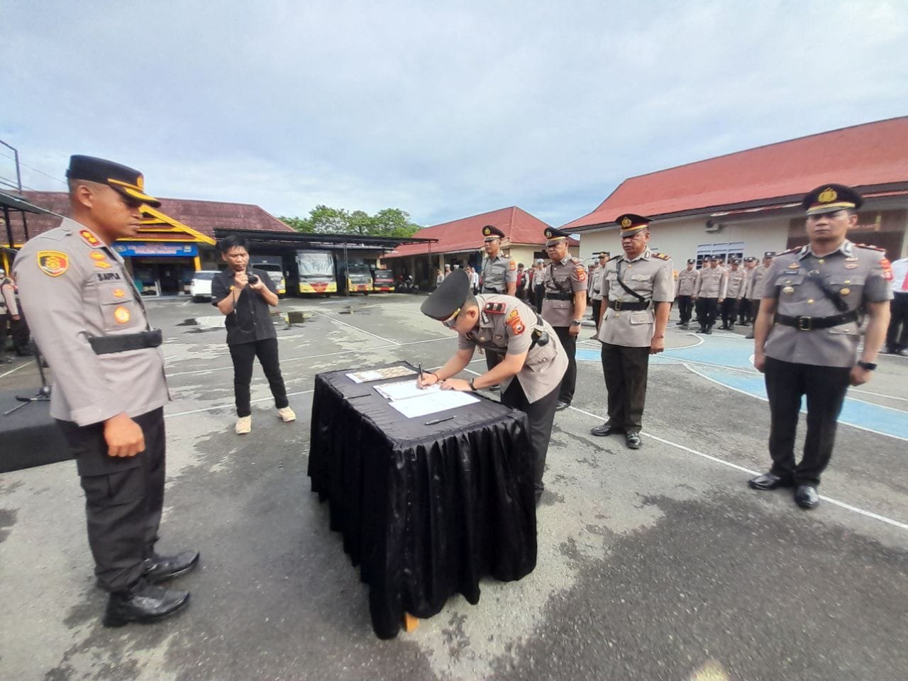 Serah terima jabatan berlangsung di Lapangan Apel Polres Palopo dihadiri parapejabat Polres dan puluhan personil lainnya.