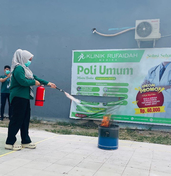 Gowa | Salah satu Fasilitas Kesehatan Tingkat Pertama (FKTP) Klinik Rufaidah Medika melaksanakan Pelatihan Manajemen Keselamatan dan Kesehatan Kerja (K3) & Alat Pemadam Kebakaran (APAR) Pada Fasilitas Layanan Kesehatan (Fasyankes), Sabtu (7/9) di Klinik Rufaidah Medika Jalan BTN Tamarunang Indah 1 Blok G 6 No. 1 Kabupaten Gowa .