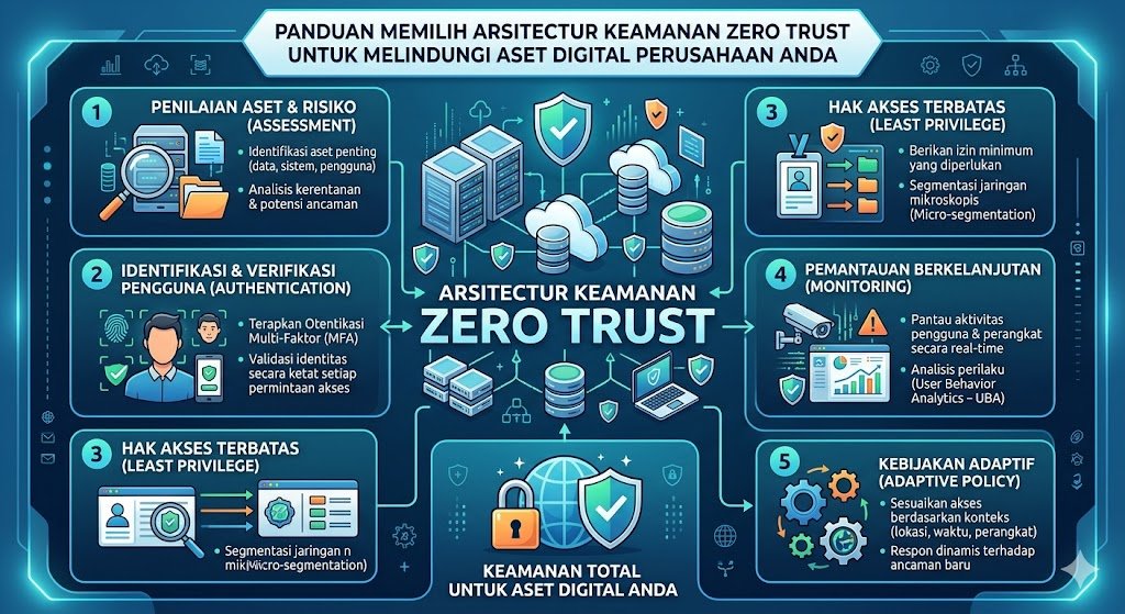 Dalam era transformasi digital yang bergerak sangat cepat, model keamanan tradisional yang mengandalkan pertahanan tepi atau perimeter-based security sudah tidak lagi memadai. Konsep lama yang menganggap bahwa segala sesuatu di dalam jaringan internal dapat dipercaya telah menjadi celah fatal bagi serangan siber modern. Sebagai solusinya, muncul arsitektur keamanan Zero Trust yang mengusung prinsip utama untuk tidak pernah percaya dan selalu memverifikasi setiap upaya akses, dari mana pun asalnya. Memilih arsitektur Zero Trust yang tepat merupakan langkah strategis yang krusial bagi perusahaan untuk menjaga integritas dan kerahasiaan aset digital mereka yang paling berharga.