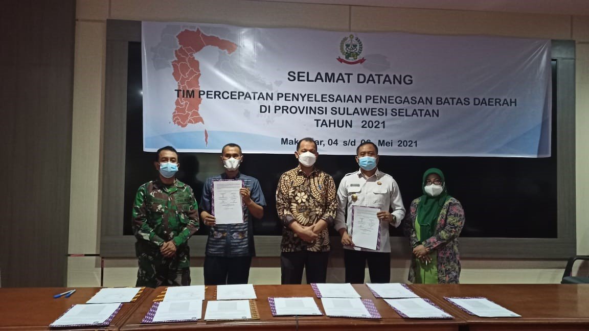 MAKASSAR, | Tim Penegasan Batas Wilayah yang dipimpin langsung oleh Asisten I Bidang Pemerintahan dan Kesra, Rudi Dappi, Kepala Bappelitbangda, Ahmad Awwabin, Kabag pemerintahan, Enrika, dan kabid RR BPBD Kosmas Toding, mengikuti rapat koordinasi Sinkronisasi dengan Kemendagri yang difasilitasi oleh Pemerintah Provinsi Sulawesi Selatan (Sulsel) di kantor Gubernur Provinsi Sulsel di Makassar, Senin-Kamis (3-6/5/2021)