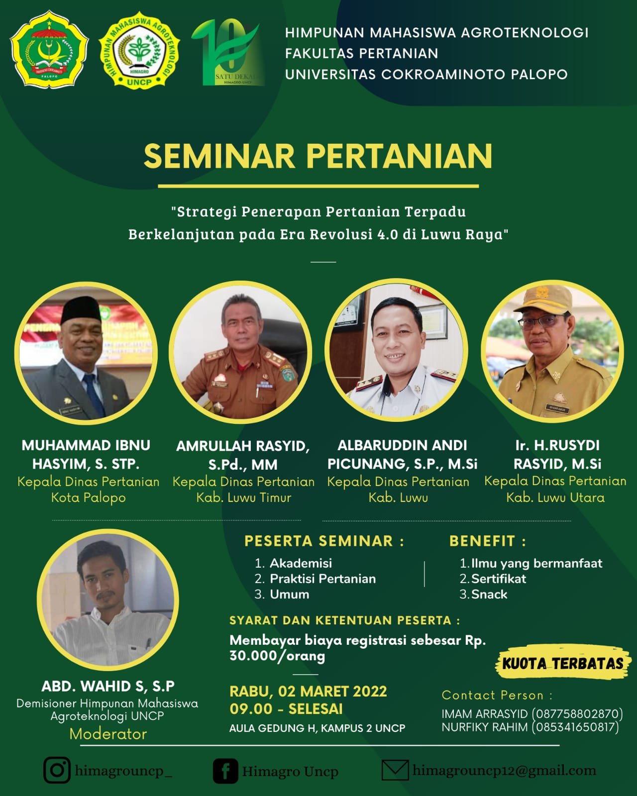” Kegiatan seminar merupakan rangkaian dari agenda milad himagro, dimana tema yang di angkat kali ini yaitu “Strategi penerapan pertanian terpadu berkelanjutan pada era revolusi 4.0 di Luwu raya,”. Tema tersebut merupakan cikal bakal dari mengembangkan pertanian di Luwu Raya , agar tingkat kesejahteraan petani dan sumber pendapatan negara pada sektor pertanian mengalami peningkatan,” Kata Ikbal, Minggu (27/02/22).
